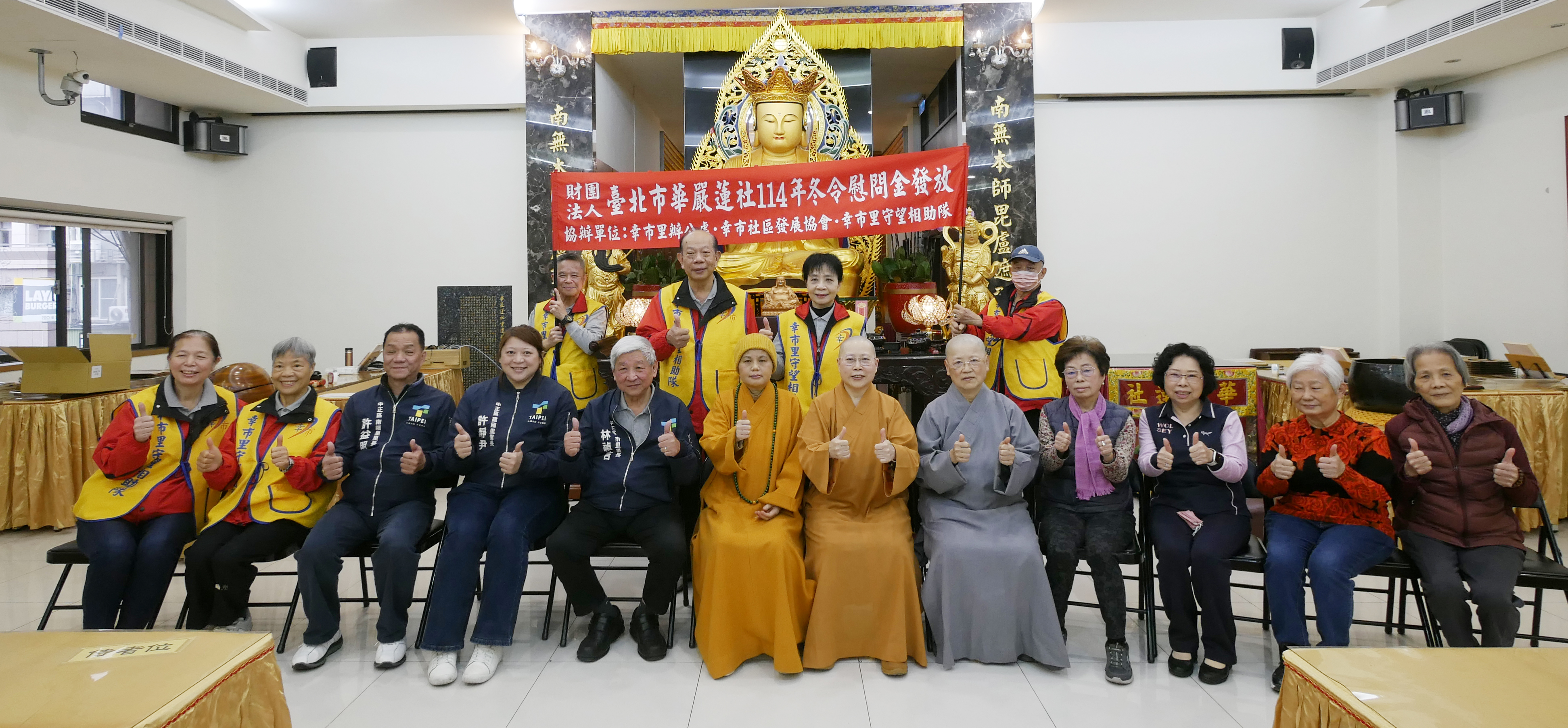1月20日臺北華嚴蓮社舉辦冬令慰問金活動,出席的有:董事長賢度法師、副董事長天演法師、臺北市中正區公所黃文麗主任祕書、中正一分局陳瑞基分局長、忠孝派出所徐群元副所長、臺北市議會應曉微議員、立法院吳沛立委辦公室黃亭瑋主任、福田功德會組長、幸市里林禎吉里長暨守望相助隊、中正區里長聯誼會陳木松會長暨全體里長。